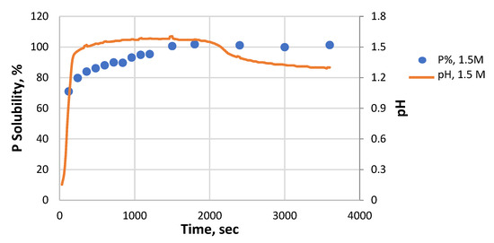 In the more concentrated 1.25 M and 1.5 M acid, three visible stages can be seen. The dissolution of P up to 80% causes the pH to increase to 1.47. The additional dissolution of 20% of P takes place at an almost constant pH value. When the maximum P solubility is reached (97%–100%), the pH value starts to decrease, and if it falls back to ~1.4, the solubility of P slightly decreases. All of this indicates that the dissolution processes taking place have different mechanisms; it can also be related to shifts in the complex ionization and solubility equilibrium.