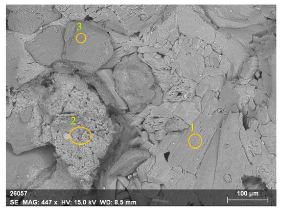 According to the literature, dissolution often starts with the formation of etch pits [56]. Therefore, the pits observed in the initial particle can start the spreading of the etch pits (i.e., the spreading of collections of vacant sites for Ca2+, PO43− and F−). The observed non-etched areas can be associated with the variability of the PR surface and impurities. The EDX analysis of different regions of the same particle (Figure 10) confirmed the diversity of the surface.