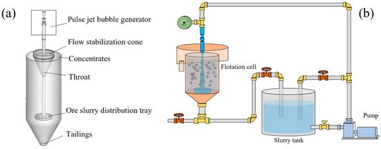 Model of the pulse jet flotation machine (a) and schematic of flotation process system (b).