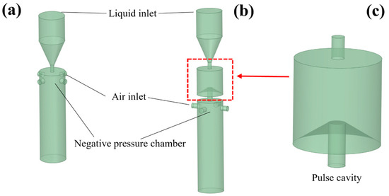 A model of the PJFM bubble generator was established based on the structural parameters. The pulse cavity, which is the key structure in the bubble generator, was investigated for its effect on the flow field. For comparison, a normal nozzle without a pulse cavity was also established. Figure 2 shows models of both types of bubble generators.