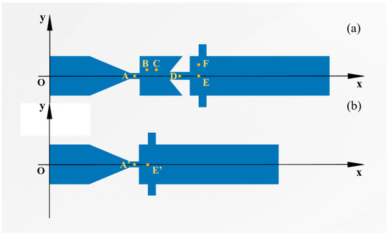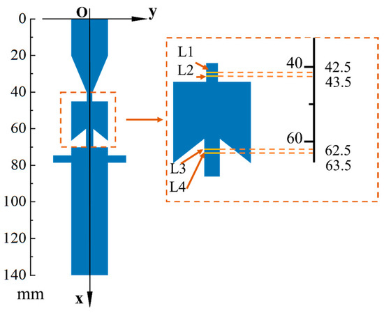 To examine the impact of the pulse cavity on jet velocity, two lines were established at the upper and lower nozzles, respectively. Several points on the lines were selected to observe the jet velocity characteristics in the tangential direction. The location and coordinates of the focused plane lines are presented in Figure 8.