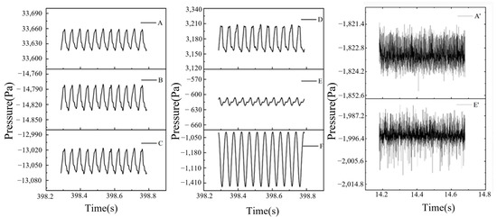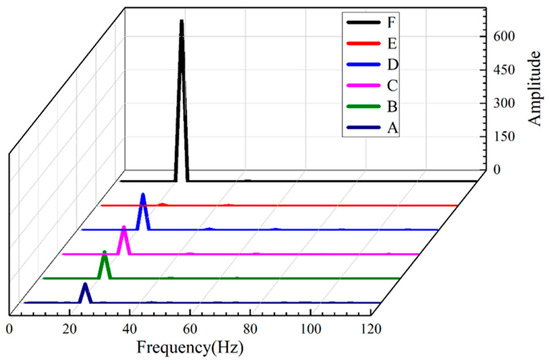 Figure 7 displays the frequency domain of pressure variation obtained by applying the FFT (Fast Fourier Transform) to the time domain of pressure variation at each monitoring point in the PJFM. The Fourier spectrum displays sharp peaks at the same frequency, indicating better pulse characteristics [13]. The pressure pulsation amplitude at the outlet of the upper nozzle is approximately 90. As the fluid enters the pulse cavity and flows out from the lower nozzle, the amplitude of the pulsation gradually increases. At the point of maximum negative pressure at the lower nozzle F, the amplitude is close to 700. This indicates that the pulsation intensity of the fluid generated by the resonant cavity gradually increases as it passes through the pulse cavity and finally outflows from the lower nozzle.