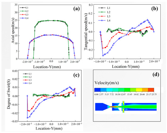 Axial velocity distribution of the upper and lower nozzle positions (a). Tangential velocity distribution of the upper and lower nozzle positions (b). Degree of swirl distribution at the upper and lower nozzles (c). Velocity contour of the pulse nozzle (d).