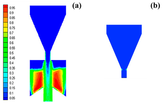 Gas volume fraction in the (a) pulse jet cavity and (b) normal nozzle.