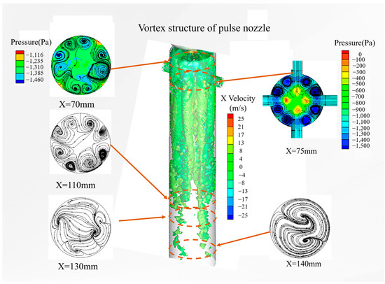Figure 11 shows the typical appearance of eight vortex tubes in the flow direction, from the nozzle discharge to the front of the mixing chamber, which appear between four adjacent inlets designed on the pulse jet bubble generator. During development, adjacent vortex structures interact and influence each other, causing the distortion and deformation of the vortex. As the jet cross-section advances, the large-scale flow-direction vortex tube structure breaks down into smaller flow-direction vortex structures.