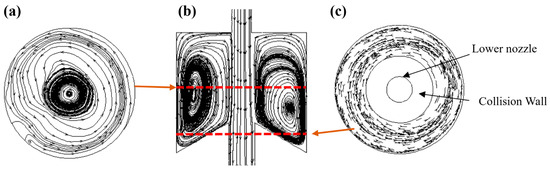 The vorticity is high, and the vortex lines are tightly packed in the middle part, while there are fewer vortex lines in the surrounding area, resulting in a lower vortex volume (Figure 12a). Figure 12b presents the distribution of vortex lines in the pulse cavity. A transverse annular air vortex is generated within the pulse structure due to the presence of the cavitation phenomenon. Due to the pulse structure, the fluid that enters from the upper nozzle cannot be fully ejected in a short time. As a result, the fluid concentration in the vicinity of the lower nozzle distributes the transverse vortex volume in a certain gradient. Additionally, the axial annular fluid (vortex) also affects the vortex generated in the pulse cavity, causing it to not be on the same horizontal plane. The annular fluid is affected by the collision wall and creates a strong vortex in the collision wall area, as depicted in Figure 12c. The axial and lateral vortices in the pulse cavity work together to increase momentum exchange between materials, leading to improved slurry mixing and mineralization. The mineralization process is explained as vortex mineralization and cavitation mineralization.