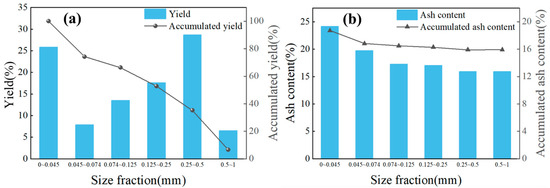 The relationship between (a) yields and size fractions of coal slime and (b) ash content and size fractions of coal slime.