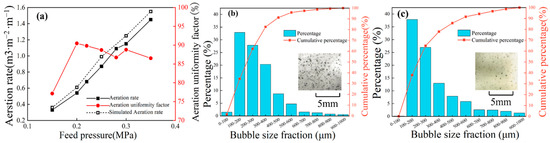 In addition to experimental tests, we also simulated the aeration rate of the PJFM. Figure 14a shows the influence of feed pressure on aeration performance. The numerical simulation’s inflation volume is consistent with the experimental inflation volume, verifying the simulation’s correctness. The inflation uniformity coefficient is greater than 70% when the feeding pressure is higher than 0.15 MPa. When the feed pressure exceeds 0.25 MPa and the aerating rate is above 0.8 m3/(m2·min), the inflatable performance of the PJFM exceeds the requirement of MT/T652-1997, which stipulates the inflatable performance index of the flotation machine. The PJFM has a large adjustable range of inflation volume, indicating wide applicability.