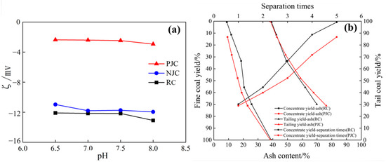 Electric potential of coal with different treatment methods (a). Stepwise release curves of RC and PJC flotation and variation in RC and PJC concentrate yield with flotation times (b).