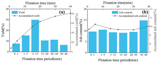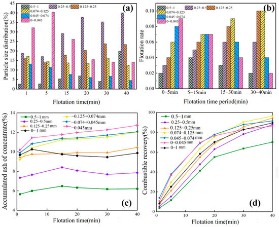 The results of the tests (shown in Figure 17a) indicate that when the flotation time is 1 min, the predominant particle size in the refined coal products is −0.045 mm with a proportion of 32.24%, and the second particle size is 0.25~0.5 mm with a proportion of 18.79%. When the flotation time was 5 min, the predominant particle size of the refined coal remained 0~0.045 mm with a proportion of 40.38%, and the following particle size was 0.25~0.5 mm with a proportion of 17.11%. This indicates that these two particle categories are floated preferentially and at a rapid rate during the pre-flotation period. When the flotation duration reaches 15 min, the predominant particle size of refined coal products at 5~15 min, 15~20 min, 20~30 min, and 30~40 min is 0.5~0.25 mm, and the proportion of low ash coarse particle size (0.5~1 mm) that is floated out increases.
