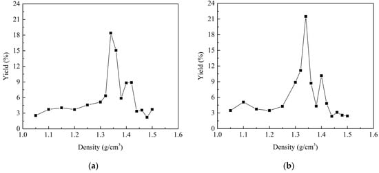 The density gradient centrifugation [7] method was used to prepare vitrinite-rich coal and inertinite-rich coal, and the densities of zinc chloride (ZnCl2) specific gravity liquid were set to 1.05, 1.10, 1.15, 1.20, 1.25, 1.30, 1.32, 1.34, 1.36, 1.38, 1.40, 1.42, 1.44, 1.46, 1.48, and 1.50 g/cm3. The centrifugation speed and time were fixed at 3000 r/min and 25 min, respectively. Figure 1 shows the density distribution of the coal samples. As displayed in Figure 1, the vitrinite-rich of the DLT5−2 and BLT2−2 coal were concentrated in the density range from 1.30 to 1.38 g/cm3, and 1.25 to 1.36 g/cm3, respectively. The inertinite-rich of the DLT5−2 and BLT2−2 coal were concentrated in the density range from 1.38 to 1.44 g/cm3.