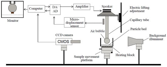 Induction times between bubbles and coal macerals were measured using a 2017EZ-B+ Induction timer, as shown in Figure 2, manufactured by Oil Sands Environmental Development & Services, Inc. (Edmonton, AB, Canada). For each measurement, coal maceral (0.5 g) was stirred and settled in a beaker containing deionized water, and the suspension was removed. Following this, the coal slurry was transferred to a measurement vessel pre-filled with two-thirds deionized water. This process resulted in the formation of a flat particle bed with uniform thickness at the bottom of the vessel (shown in Figure 3). The amplitude of the bubble motion was set as 3 V, the times to approach and retraction were fixed on 10 ms, and the air/oily bubble size was kept at 1.3 mm. During the measurement, air needs to be drawn into the glass capillary tube beforehand. When the bottom of the capillary tube was immersed in the water in the measurement vessel through the controller, an air bubble with controllable size could be generated at the end of the capillary tube using a microsyringe. However, it should be noted that when an oily bubble is needed, a small volume of (modified) diesel oil should be sucked into the capillary tube before being immersed in the water. Then, a (modified) diesel oily bubble could be generated at the end of the capillary tube by pushing air using the microsyringe. The generated air/oily bubble was brought into contact with the particle bed for a preset period, as shown in Figure 3. In this way, the corresponding induction time can be obtained. A more detailed description of the measurement process could be found in previous reports [36,37,38]. The measurements were carried out at room temperature. Each experiment was repeated five times, and the average value was reported.