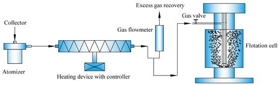 To obtain a better flotation performance, a custom-made device for oily bubble generation was designed based on the atomization and flash evaporation methods [19]. The schematic diagram of oily bubble flotation setup is shown in Figure 4. According to the characteristics of the test device, the collector (diesel oil) used for oily bubble flotation was added through the inflation tube of the flotation machine at dosages of 0.66, 1.32, 1.98, 2.64, and 3.30 kg/t. The rated air flow rate of atomizer was 6 L/min, and the atomizing rate of collector was kept at 0.299 g/min. The skimming time was 40 s, and the other parameters were the same as those used in the conventional flotation tests. A detailed description of the oily bubble flotation procedure can be found in previous reports [20,36].