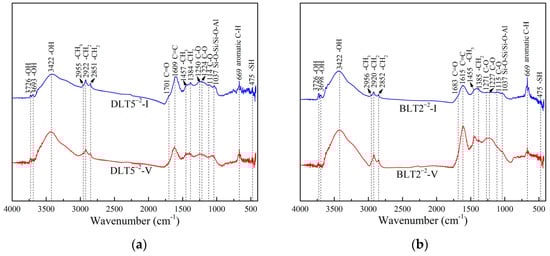 FT-IR spectra of the coal samples: (a) DLT5−2 coal; (b) BLT2−2 coal.
