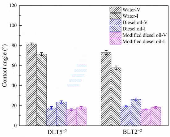 Figure 8 shows the contact angles of water, diesel oil, and DP-modified diesel oil droplets on coal macerals. The contact angle of the water droplets on the surface of the vitrinite-rich coal and inertinite-rich coal of DLT5−2 is, respectively, 81.7° and 71.5°, and that for BLT coal is 73.1° and 57.9°, indicating that the vitrinite-rich coal is more hydrophobic, which is highly consistent with the results of the functional group analysis. In addition, for DLT 5−2 coal, the contact angle of the diesel oil droplets on the surface of vitrinite-rich coal and inertinite-rich coal is separately 17.9° and 23.7°. Similarly, for BLT2−2 coal, the contact angle of the diesel oil droplets on the surface of vitrinite-rich coal and inertinite-rich coal is 19.7° and 26.4°, respectively. The results show that diesel oil droplets can easily spread on the surface of vitrinite-rich coal, which is beneficial for enhancing its hydrophobicity. Moreover, the contact angle of modified diesel oil droplets containing DP on the surface of vitrinite-rich coal and inertinite-rich coal for DLT5−2 coal is 16.1° and 18.0°, and that for BLT2−2 coal is 16.3° and 18.3°, respectively, indicating that while the addition of DP could further increase the hydrophobicity of both vitrinite-rich coal and inertinite-rich coal, the hydrophobicity of vitrinite-rich coal is still higher than that of inertinite-rich coal.