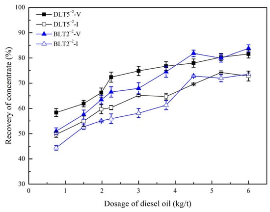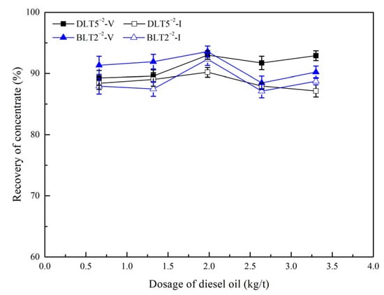 The recoveries of conventional flotation and (modified) oily bubble flotation of vitrinite-rich and inertinite-rich coal are compared in Figure 12. Figure 12 shows that the flotation recovery of the vitrinite-rich coal is greater than that of the inertinite-rich coal for both conventional flotation and (modified) oily bubble flotation. At a diesel oil dosage of 1.98 kg/t, the recoveries of vitrinite-rich and inertinite-rich coal of DLT5−2 by conventional flotation were 66.27% and 63.43%, and those of BLT2−2 were 59.68% and 55.06%, respectively. However, the recoveries of vitrinite-rich and inertinite-rich coal by oily or modified oily bubble flotation were 92.91% and 86.26% for DLT5−2, and that were 90.13% and 82.88% for BLT2−2, respectively. Compared with those of conventional flotation, when oily or modified oily bubble flotation was used, the recoveries of vitrinite-rich and inertinite-rich coal for DLT5−2 increased by more than 26.64% and 30.45%, respectively. For modified oily bubble flotation, the recoveries of vitrinite-rich and inertinite-rich coal for BLT2−2 were 22.83% and 27.82% higher than those of conventional flotation, respectively. The above results are in agreement with the measurements of the induction times and contact angles between the (modified) diesel oily bubbles and coal macerals. Hence, oily bubble flotation is proven to be an effective method for improving the recoveries of vitrinite-rich coal and inertinite-rich coal.