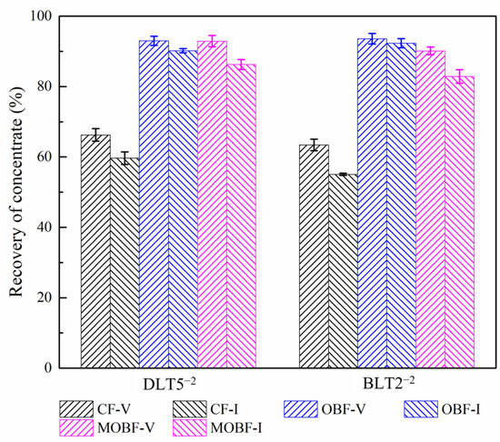 Based on the above-described results, the oily bubbles were further modified by the surfactant DP to increase the recovery differences between the vitrinite-rich and inertinite-rich samples for the same coal (DLT or BLT) in order to improve the selectivity of the same collector for the two coal macerals.