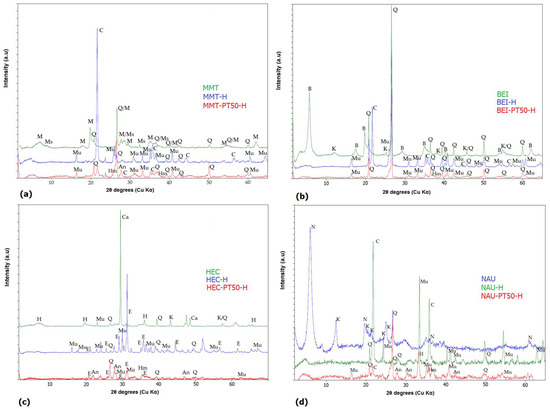 XRD patterns: (a) MMT, MMT-H and MMT-PT50-H; (b) BEI, BEI-H and BEI-PT50-H; (c) HEC, HEC-H and HEC-PT50-H; (d) NAU, NAU-H and NAU-PT50-H. M—montmorillonite, B—beidellite, H—hectorite, N—nontronite, K—kaolinite, Q—quartz, Mu—mullite, E—enstatite, An—anorthite, Hm—hematite, C—cristobalite, Ms—muscovite, Ca—calcite.