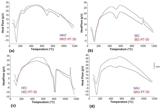 DTA curves: (a) MMT and MMT-PT50; (b) BEI and BEI-PT50; (c) HEC and HEC-PT50; (d) NAU and NAU-PT50.