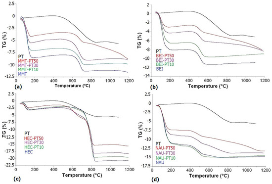TG curves: (a) PT, MMT and its PT mixtures; (b) PT, BEI and its PT mixtures; (c) PT, HEC and its PT mixtures; (d) PT, NAU and its PT mixtures.