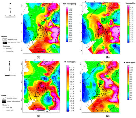 - The U concentration is higher in the eastern area of LOP, exhibiting a NNE-SSW trend. A closer examination shows that the U concentration is highest in the ESE zone of the pluton, where there is intense WNW-ESE fracturing. Additionally, the high U concentration is spatially related to the NNE-SSW fault, parallel to the regional Penacova-Régua-Verin fault (Figure 1 and Figure 3d).