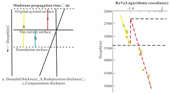 The principle of this method is based on the difference of vitrinite reflectance (Ro) between the upper and lower strata of the unconformity surface. The specific method is to make the stratum Ro line under the unconformity surface intersect with the unconformity surface and extend the line to the depth where the Ro value is equal to the bottom interface value of the underlying stratum. [35,36]. The difference in height is the erosion thickness (right in Figure 3). The Ro change between this point and the unconformity surface is discontinuous. This method is quantifiable and easy to perform, so it is widely used in erosion thickness restoration. However, Dow ’s vitrinite reflectance method ignores the influence of secondary burial, which is the factor affecting the vitrinite reflectance. Therefore, the calculated denudation thickness is the minimum denudation thickness of the formation [17,18,19,20,21,22,23,24,25,26,27,28,29,30,31,32,33,34,35,36,37,38,39,40,41].