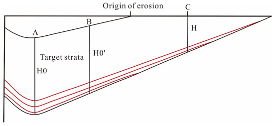 Regionally, a specific sedimentary layer features a certain pattern in terms of its planar distribution of deposition thickness. As shown in Figure 4, wells in which the sedimentary layer is not denuded or the erosion thickness of this layer is easy to calculate, in accordance with drilling data and seismic data, are selected as the reference wells. Then, the formation erosion thickness is tracked and computed as per the stratigraphic trend. As long as a seismic profile is available, this approach is practicable, with high applicability and yet a flaw of high lateral variation of the calculation results [32,42,43,44]. In Figure 4, H0-H0′ represents the erosion thickness in the B zone, and H0-H, that in the C zone.