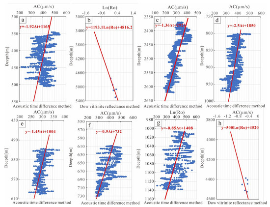 Figure 5. Schematic diagram of restoring the formation erosion thickness via the interval transit time and vitrinite reflectance approaches. (Images were changed in regard to font and clarity.). (a) The erosion thickness of the Middle Yanshanian uplift for Well QS-1 is 200 m. (b) For Well PT-1, the vitrinite reflectance approach was used to calculated erosion thickness is 402 m. (c) The erosion thickness of the Early Himalayan uplift for Well L-30 is 449 m. (d) The erosion thickness of the Late Himalayan uplift for Well L-30 is 380 m. (e) The erosion thickness of the Late Himalayan uplift for Well K-28 is 466 m. (f,g) The erosion thicknesses of the Late and Early Himalayan uplift for Well LT-1 are 174 m and 279 m, respectively. (h) For Well SK-1, the erosion thickness of the Late Indosinian uplift is estimated to be 1129 m.