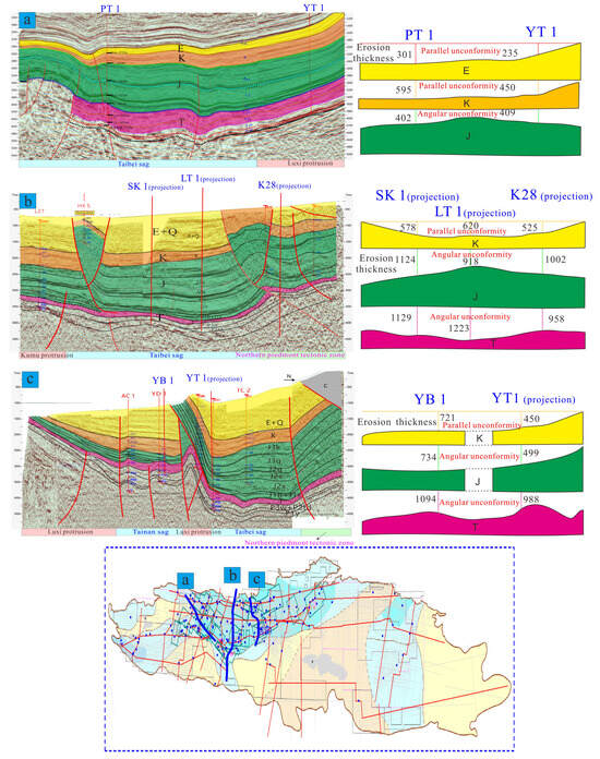 Figure 6 illustrates how the formation erosion thickness is restored via the seismic stratigraphic trend correlation approach. Figure 6a is the seismic profile across Well PT-1 (north) to Well YT-1 (south). As the erosion thickness of the Middle Yanshanian uplift for Well PT-1 is known to be 402 m, that of Well YT-1 is estimated to be 499 m. Similarly, for the Late Yanshanian uplift, the erosion thickness of Well PT-1 is 595 m, and that of Well YT-1 is thus estimated to be 450 m. The north–south seismic profile across Well K-28 (projection)–LT-1 (projection)–SK-1 (projection) is shown in Figure 6b. The erosion centers of both the Triassic and Cretaceous are located in the proximity of Well Lingtan-1, and the formations thicken toward both the north and south. Nonetheless, the deposition center of the Jurassic is located at Well Lingtan-1, and the formation thins toward the northern piedmont zone and Well SK-1 (in the south). Accordingly, for the Late Indosinian uplift, the erosion thicknesses along Wells SK-1–LT-1–K-28 are 1129 m (reference well), 1223 m and 958 m, respectively. For the Middle Yanshanian uplift, the erosion thicknesses along Wells SK-1–LT-1–K28 are 1124 m (reference well), 918 m and 1002 m, respectively. For the Late Yanshanian uplift, the erosion thicknesses along Wells LT-1–SK-1–K-28 are 620 m, 578 m (reference well) and 525 m, respectively. Figure 6c represents a north–south seismic profile along Wells YT-1 (projection)–YB-1. For the Late Indosinian uplift, the erosion thicknesses on the northern and southern sides of the Mountain of Flames (Huoyanshan) are consistent. The erosion thickness of Well YT-1 at this time is 988 m, while that of Well Yubei-1 is 1024 m. For the Middle Yanshanian uplift, the erosion thickness is higher on the southern side of the Mountain of Flames, and the Kalazha Formation is completely denuded. At this time, the erosion thickness of Well YT-1 is 499 m, and that of Well Yubei-1 is 743 m. For the Late Yanshanian uplift, the formations thin southward from the Mountain of Flames, and, therefore, the erosion thickness is increased. At this time, the erosion thickness of Well Yutan-1 is 450 m (reference well), and that of Well Yubei-1 is estimated to be 721 m.