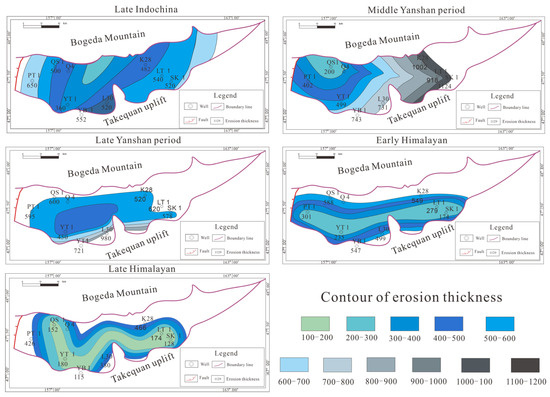 The Turpan–Hami Basin is found with three major events of uplift and denudation, namely the Late Indosinian (at the end of the Permian Period), Middle and Late Yanshanian (at the end of the Jurassic and Cretaceous Periods, respectively) and Himalayan (during the Mesozoic Era). These four tectonic movements occur in different locations and have different effects [40,48,49,50]. The process and results of the erosion thickness restoration are presented below: