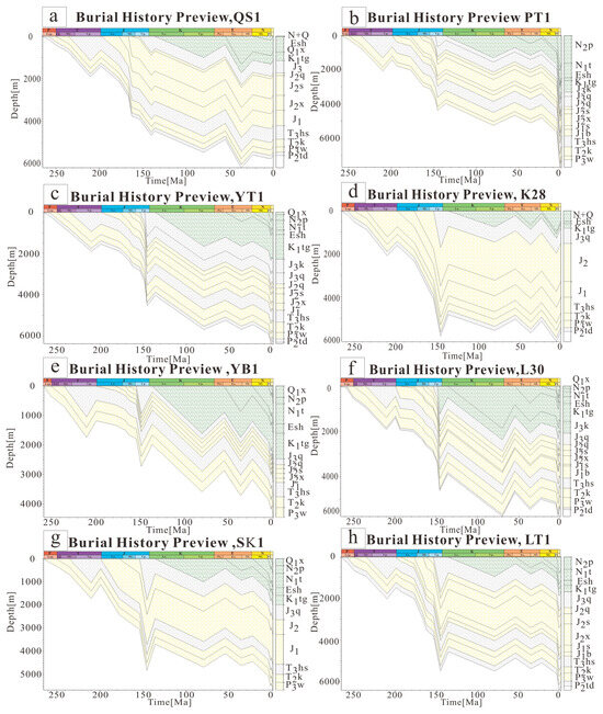 The burial history refers to the burial depth variation of sequences/layers in a sedimentary unit or a series of units from the beginning of the sedimentation to now or within a specific geological period. It includes events such as deposition interruption denudation and faulting [48,52,53]. In this research, the back-stripping approach available in the PetroMod software was used for the modeling and restoration of the basin’s burial history. The back-stripping technique, based on the sedimentation and compaction theory, is commonly applicable to formations of normal compaction. In accordance with the stratigraphic parameters of wells, it incorporates the effects of geological events such as compaction, over-pressurization, uplift and denudation and faulting, and it restores the formation thickness, layer by layer, up toward to the surface for each geological historic period. Finally, the profile between the geological age and burial depth in wells is obtained. The burial history was reconstructed using the 1D PetroMod simulator, and the necessary inputs are stated above. The modeling results of eight wells in different sub-sags are shown below (Figure 8).