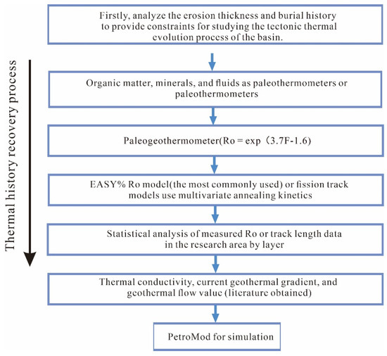 The workflow to reconstruct the thermal history is presented below (Figure 9). The heat flow (density) is a comprehensive thermal parameter representing the regional geothermal status and defined as the heat released from a unit area of the Earth’s surface per unit time [56,57,58].