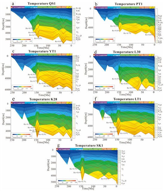 Figure 10. Thermal history of representative wells in the Taibei Sag, reconstructed by PetroMod. (a) thermal history, QS 1. (b) thermal history, PT 1. (c) thermal history, YT 1. (d) thermal history, L 30. (e) thermal history, K 28. (f) thermal history, LT 1. (g) thermal history, SK 1.