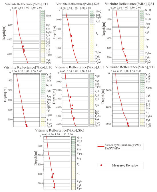 Figure 11 shows the comparison and verification of single-well geothermal–thermal simulation results and measured maturity in the Shengbei, Huobei, Lianbei and Shanbei sub-sags of Taibei Sag. Among them, the fitting results of the PT-1 Well, K-28 Well, LT-1 Well and SK-1 Well are good, and the fitting results of the QS-1 Well, YT-1 Well and L-30 Well are good. This shows the reliability of the fitting results.