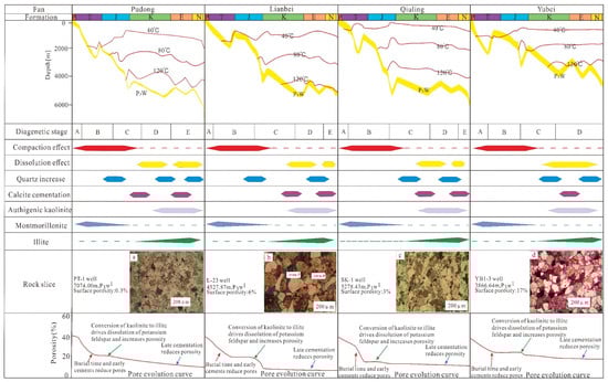 From the Late Triassic epoch to the Mid–Late Jurassic epoch, the underlying Taodonggou Group source rocks became mature and expelled hydrocarbons, and yet, the hydrocarbon expulsion time is somewhat differentiated among different sub-sags, as stated above. The results show that from the Late Triassic to the Middle and Late Jurassic, the source rocks of the Permian Taodonggou Group matured and expelled hydrocarbons, and there was little difference in the hydrocarbon generation time of different sub-sags. Due to the neighboring between the source rocks and the Wutonggou reservoirs, hydrocarbons first enter the Wutonggou Formation reservoirs. The burial depths of different fan bodies are varied, and so are the hydrocarbon emplacement time and experienced diagenetic processes [67]. The Wutonggou Formation sandstone reservoir in the Taibei Sag is highly compacted. The contact among grains is mainly line contact, and the primary pores are mostly destructed, both implying considerable compactions. In the later stage, carbonate minerals occur extensively in the forms of cement and metasomatism, and the quartz overgrowth is identified as the II–III grade [73]. As shown in Figure 12, the diagenesis has reached the meso-diagenetic A phase, and some fan bodies even present the highest diagenesis of the meso-diagenetic B phase, e.g., the Pudong fan group (Figure 13). The modeled porosity curve shows that the porosity of the Yubei fan group is 18%, higher than those of the Lianbei fan body and Qiuling fan group, and the least porosity of 12% occurs in the Pudong fan group. Such an understanding is validated by the observed plane porosity of casting thin sections. The casting thin section plane porosity of the Wu-I Member, Well YB1-3, the Yubei fan group, is 17%, higher than those of Well L-23, the Lianbei fan body; and Well SK-1, the Qiuling fan group (6% and 3%, respectively). The burial depth of the Pudong fan group is the highest and exceeds 7000 m, and the casting thin section plane porosity of the Wu-I Member is 0.3%. It is confirmed that the Yubei fan group has better reservoir physical properties. At present, the burial depth of the Wutonggou Formation in the Taibei Sag is commonly 4000–6000 m, while Wells LN-1, YG-7 and AC-1 in the Tainan Sag reveal that the burial depth in the Wutonggou Formation ranges from 2000 m to 4000 m. In other words, the southern region is located in the higher position of the fan slope. This oil explains why oil and gas reservoirs largely occur in the southern part of the Taibei Sag and Tainan Sag [71,72,73,74,75,76,77].