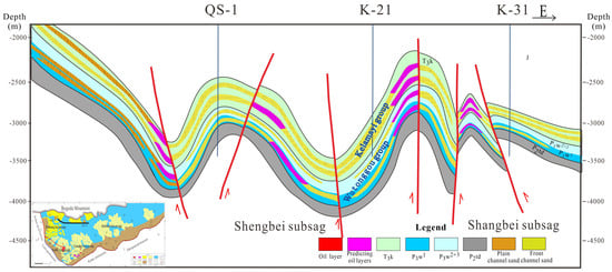 Figure 14. Section of the predicted oil reservoir across the Shengbei sub-sag and piedmont zone of the Shanbei sub-sag.
