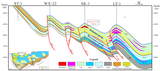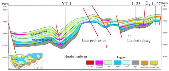 The discovered existing pre-Jurassic oil reservoirs are mostly distributed in the southern part of the Taibei Sag and Tainan Sag, and these reservoirs may store either heavy oil or light oil [79,80]. The generation of heavy oil has been investigated extensively. It is related to the uplift and exposure of the reservoir subject to meteoric weathering and leaching [81,82,83]. By far, the discovered heavy oil reservoirs mostly occur in the Wutonggou Formation and Karamay Formation, and the oil source correlation shows that such heavy oil is sourced from the Taodonggou Group source rocks in the Taibei Sag [84,85]. The oil reservoir sections of different sub-sags in the study area are presented in Figure 14, Figure 15 and Figure 16. The section in Figure 14 intersects the Shengbei sub-sag and the piedmont zone of the Shanbei sub-sag. The shown oil reservoir is controlled by the source-connecting fault and underlying source rocks and has good preservation conditions. However, no oil reservoir sourced from the Permian source rocks has been found, due to the low efforts in exploration. The section in Figure 15 cuts both the Huobei sub-sag and Lianbei sub-sag. Well YT-1 presents cores with oil stains and oil patches from both the Wutonggou and Karamay Formations, thus indicating the previous presence of paleo-oil reservoirs in the southern part of the sub-sag. Whether or not such paleo-oil reservoirs are destructed or they serve as part of the migration paths of hydrocarbons remains a puzzle and is under investigation. Nevertheless, the core observations raise confidence in hydrocarbon exploration in the Huobei Sag [86]. Figure 16 is a north–south oil reservoir section intersecting the nose-like uplift in the Central–Southern Shanbei sub-sag. Well SK-1 discovers a light oil reservoir in the Karamay Formation, while Well LT-1 fails. The discovered Permian and Triassic oil reservoirs are predominantly located in the structural slope and anticline zones in the south, which stimulates the confidence in the exploration of oil and gas reservoirs in the piedmont zone. Statistics of the fault amplitude of the oil reservoir sections (Figure 17) suggest high relevance to the last Himalayan movement and also reflect degrees of damage to oil reservoirs [87,88]. The fault amplitude in the Eastern Taibei Sag is larger than in the western part, and the current oil reservoir distribution features the pattern of reservoirs underlain by source rocks. Therefore, faults connecting source rocks are vital for the formation of oil reservoirs. The lowest fault amplitude is found in the oil reservoir section of the Huobei sub-sag, and the Lukeqin large oil reservoir occurs in the south of the Huobei sub-sag. Furthermore, the fault amplitude of the oil reservoir section across the Central–Southern Shanbei sub-sag grows from north to south, and the Karamay Formation oil reservoir found in Well SK-1 lies in the Central–Northern Shanbei sub-sag [89,90]. Comprehensively, a fault amplitude below 80 m is favorable for the formation of oil reservoirs. With a fault amplitude exceeding this threshold, it is increasingly challenging to form or preserve oil reservoirs. The structural slope and anticline zones of the Huobei, Shengbei and Lianbei sub-sags are in favor of raising reserves and production of hydrocarbons.