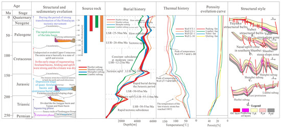Figure 18. Matching among the burial, thermal, porosity evolution and structural–sedimentary evolution history of each sub-sag of the Taibei Sag, the Turpan–Hami Basin (ad).