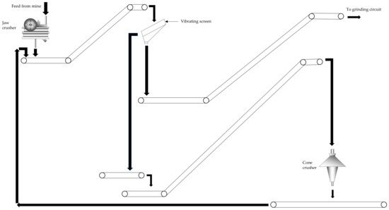 Figure 1 and Figure 2 show the crushing and grinding circuits, respectively. The crushing plant consists of a jaw crusher, which feeds a vibratory screen and two cone crushers (one cone crusher is used as a backup—one cone crusher is shown in Figure 1 for simplicity). The vibratory screen undersize goes to the grinding circuit and the oversize goes to the cone crusher. The cone crusher product is conveyed back to the vibratory screen for classification. The grinding circuit consists of an ore silo, a primary ball mill, a primary vibrating screen, two secondary ball mills in parallel and a cyclone pack. The silo feeds the primary ball mill, and the discharge product goes to the primary screen. The primary screen oversize is recirculated back to the primary ball mill feed. The primary screen undersize is combined with the secondary mills’ discharges in a tank which feeds the cyclone pack. The cyclones’ underflow feeds the secondary ball mills (these mills are in parallel—below 180 t/h, only one secondary ball mill is operated), and the overflow of the cyclone pack is the flotation feed.