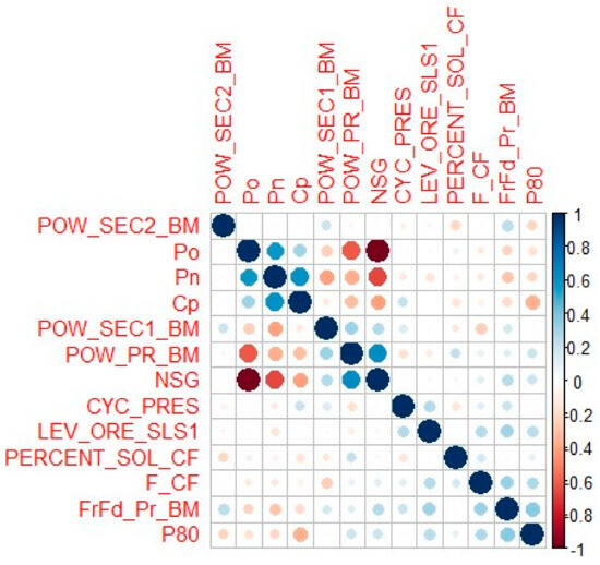 Figure 3 shows the correlation plot for the parameters. The scale is between −1 to +1. A score of −1 means 100% negatively correlated, and +1 means 100% positively correlated. The positively correlated variables are in blue, and the negatively correlated variables are in orange. The bigger and darker the circles, the stronger the correlations and vice versa. This information provides the plant metallurgists with the strength of the correlation between parameters and whether they are positively or negatively correlated. The R (Studio) programming language also provided correlation values (part of the results shown in this paper), and correlations approximately ≤−0.60 and ≥0.60 were considered to be strong. Table 3 illustrates the strong correlations.