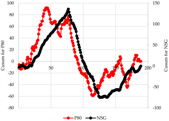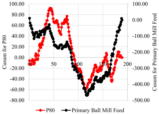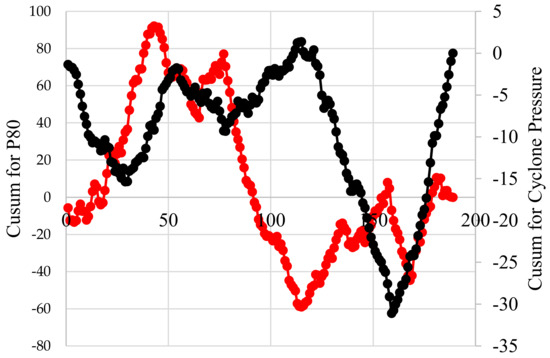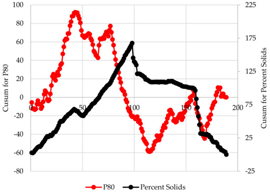 Figure 9 illustrates the CUSUM chart for P80 and cyclone pressure. The trend between the CUSUM curves should be in the opposite direction according to Equations (2) and (5). However, it was not always the case; in certain instances, they were in the same direction, which means factors other than the cyclone pressure affected P80. Figure 10 shows the CUSUM chart for P80 and percent solids. The CUSUM curves moved in the same direction, which means that when percent solids increased, P80 increased and vice versa; this is in accordance with Equation (4). However, during certain periods the opposite was observed. This means that other variables affected P80.