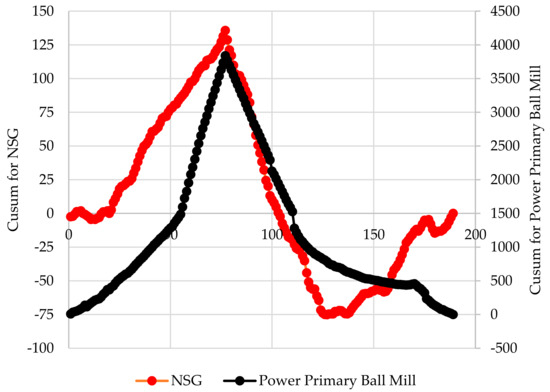 Figure 8 shows the CUSUM chart for NSG and primary ball mill power. Mostly the trends are in the same direction except starting at Observation 125 where they were in the opposite directions. This most likely occurred due to factors other than NSG affecting the primary ball mill power.