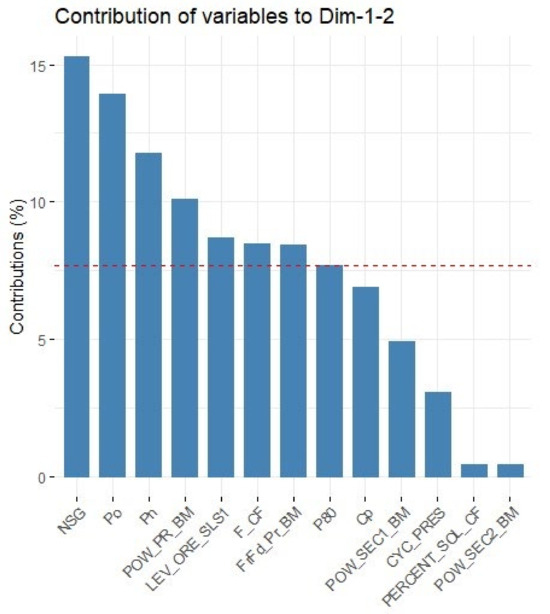 Figure 12 illustrates the percent contributions of the process parameters for thirteen variables to Principal Components 1 and 2. The percentage of the parameter contribution decreases from left to right. For example, NSG head grade contributed the highest to the Principal Components 1 and 2, followed by Po head grade, etc. Secondary ball mill #2 power made the lowest contribution to the Principal Components 1 and 2. The results presented in Figure 12 are equivalent to the “contrib” (contribution) bar in Figure 5. For example, NSG has the highest contribution to Principal Components 1 and 2 in Figure 12 and has a dark orange colored arrow in Figure 5, indicating a high contribution to Principal Components 1 and 2.