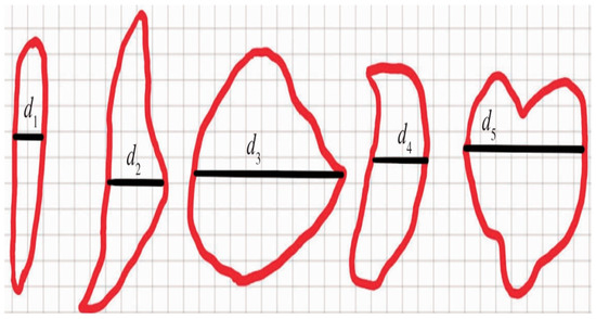 The so-called directional maximum intercept is used to measure the maximum diameter of the mineral particle in the image along a fixed direction for multiple particle sizes, as shown in Figure 2 (the particle sizes in the horizontal direction are expressed by d1, d2, d3, d4 and d5) [29].