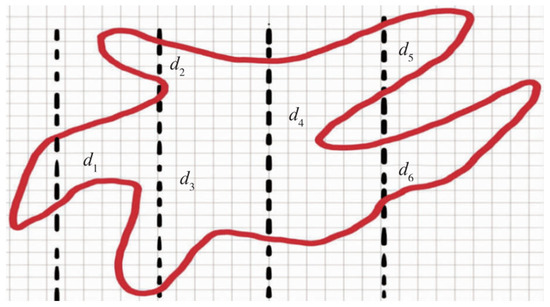 Directional random intercept is used to intercept the profiles of embedded particles in the image with equidistant directional measuring lines, and the length obtained is the directional random intercept. We then use these directional random intercepts to represent the particle size, as shown in Figure 3 the particle sizes of the same particle in the vertical direction in Figure 3 are represented by d1, d2, d3, d4 and d5 [29].