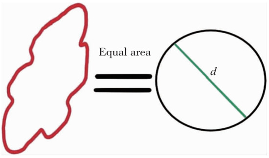 Equivalent area diameter is used to replace the particle size of the target particle with the diameter of a circle with the same area as the contour of the target mineral particle in the image, as shown in Figure 4, where represents the size of the target particle [30].