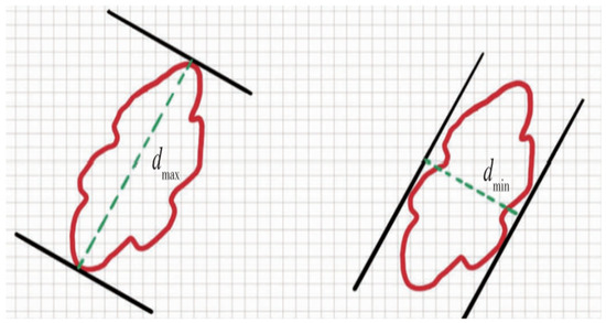 Ferret Diameter is also called caliper diameter, and its principle is that through the centers of irregularly shaped particles in an image, the particles are sandwiched between parallel lines running in any direction, that is, in a certain direction, the two straight lines are set tangential to the irregular pattern. Then, the distance between the parallel lines is taken as the Feret Diameter, as shown in Figure 5. The maximum diameter and minimum diameter of the Feret Diameter are shown in Figure 5 [31,32].