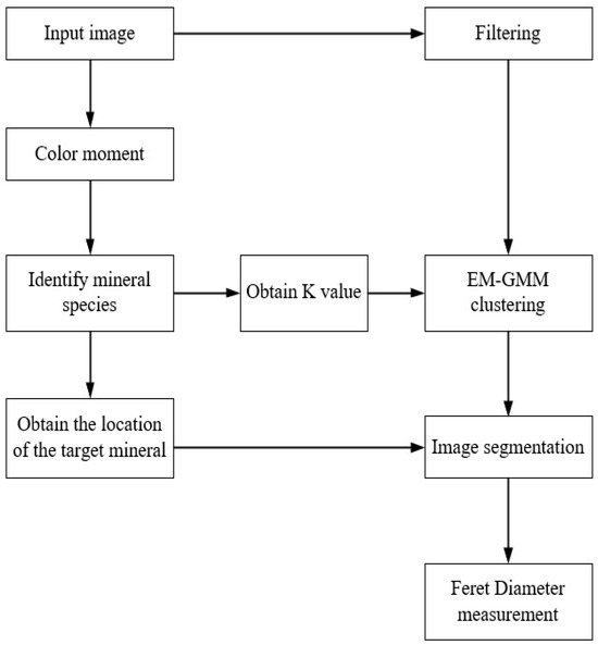 A Gaussian mixture model is a commonly used mathematical model, offering a powerful framework for clustering, pattern recognition and multivariate density estimation [16,17,18,19]. Usually, the parameters of mixed models are estimated by maximizing the likelihood function, and the Expectation Maximization (EM) algorithm is a good tool to estimate the maximum likelihood of mixed models, as it can accurately estimate the parameters of mixed models with implicit variables [20,21,22]. Therefore, a Gaussian mixture model based on an EM algorithm for measuring the embedded particle sizes of metal mineral polished sections has been proposed in this paper. Firstly, mineral images are input, and then the parameters of the model are determined using the EM algorithm. Then, the Gaussian mixture model is used to cluster the images, and the segmented mineral images are obtained. Finally, Feret Diameter is used to measure and count the mineral embedded particles and their sizes.