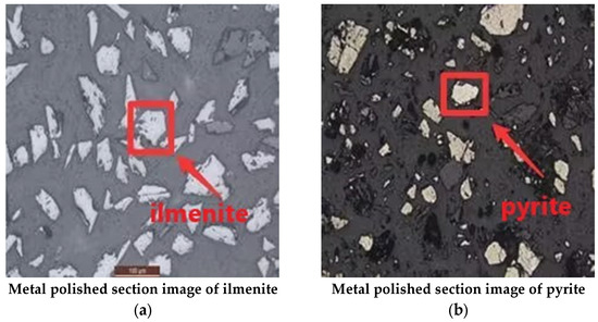 In order to verify the performance of methods for measuring embedded particle sizes in metal mineral polished sections using the Gaussian mixture model based on the EM algorithm in this paper, we have taken ilmenite and pyrite as examples, and the mineral polished section images are shown in Figure 7, which were prepared by professional technicians from the Central Laboratory of Yunnan Geological and Mineral Exploration and Development Bureau; all images have a size of 512 × 512. The computer used in the experiment in this paper is Intel Core i7, with 16G memory. All algorithms were developed using MATLAB Release 2022 a.