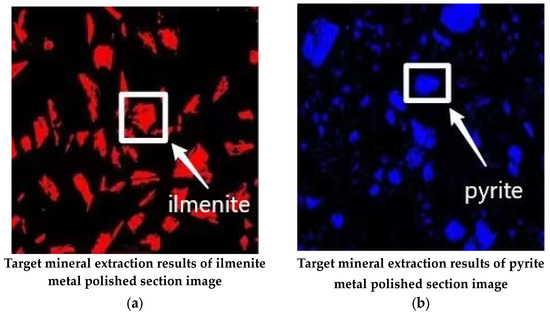 Target mineral extraction is employed to extract target minerals from a clustering result graph. Before clustering, the location of the target mineral is identified using color moments. After this step, for Figure 10, the clustering effect was combined with the locations of the target minerals identified by color moments in order to segment and extract the target minerals. The extraction results are shown in Figure 10.